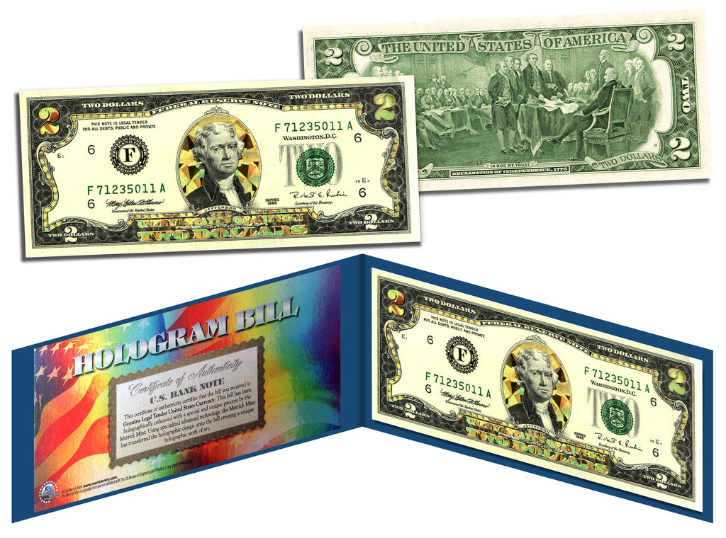 This uncirculated $2 Bill is Genuine Authentic Legal Tender of the United States, which has been holographically enhanced. Using specialized advanced technology, the Merrick Mint has permanently transferred the exclusive GOLD DIAMOND CRACKLE HOLOGRAM design onto the $2 bill creating a holographic work of art. When the light strikes the hologram, the light reflects in all directions which photography cannot capture. Included is a blue display portfolio plus a Certificate of Authenticity to guaranty that your bills are authentic and recognized by every monetary authority around the world, and assuring its Collector Edition status. Only genuine Legal Tender $2 United States Bills are used for this unique colorization process. Each $2 Bill is in FRESH, CRISP, UNCIRCULATED condition, and was directly removed from untouched wrapped Federal Reserve sealed packs. Former U.S. President Thomas Jefferson is featured on the obverse of the note, along with the special hologram overlay. The Signing of the Declaration of Independence by John Trumbull is featured on the reverse. It is the only U.S. Currency note that features two Presidents, John Adams and Thomas Jefferson, and it is one of the most rarely seen BILLS in circulation and actual use.