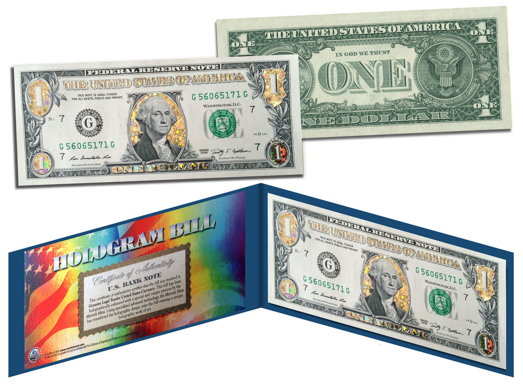 This uncirculated $1 Bill is Genuine Authentic Legal Tender of the United States, which has been holographically enhanced. Using specialized advanced technology, the Merrick Mint has permanently transferred the exclusive GOLD SHIMMERING STARS HOLOGRAM design onto the $1 bill creating a holographic work of art. When the light strikes the hologram, the light reflects in all directions which photography cannot capture. Included is a blue display portfolio plus a Certificate of Authenticity to guaranty that your bills are authentic and recognized by every monetary authority around the world, and assuring its Collector Edition status. Only genuine Legal Tender $1 United States Bills are used for this unique colorization process. Each $1 Bill is in FRESH, CRISP, UNCIRCULATED condition, and was directly removed from untouched wrapped Federal Reserve sealed packs. The first US President, George Washington, is featured on the obverse of the note, along with the special hologram overlay and the Great Seal of the United States is featured on the reverse.