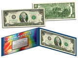 This uncirculated $2 Bill is Genuine Authentic Legal Tender of the United States, which has been holographically enhanced. Using specialized advanced technology, the Merrick Mint has permanently transferred the exclusive GOLD SHIMMERING STARS HOLOGRAM design onto the $2 bill creating a holographic work of art. When the light strikes the hologram, dozens of rainbow colors are visible which photography cannot capture. Included is a blue display portfolio plus a Certificate of Authenticity to guaranty that your bills are authentic and recognized by every monetary authority around the world, and assuring its Collector Edition status. Only genuine Legal Tender $2 United States Bills are used for this unique colorization process. Each $2 Bill is in FRESH, CRISP, UNCIRCULATED condition, and was directly removed from untouched wrapped Federal Reserve sealed packs. Former U.S. President Thomas Jefferson is featured on the obverse of the note, along with the special hologram overlay. The Signing of the Declaration of Independence by John Trumbull is featured on the reverse. It is the only U.S. Currency note that features two Presidents, John Adams and Thomas Jefferson, and it is one of the most rarely seen BILLS in circulation and actual use.