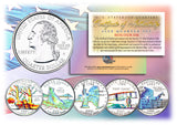 Here is your chance to own a complete set of five (5) hologram enhanced 2001 Statehood Quarters U.S. Coins featuring five states: NY, NC, RI, VT, KY. Each coin is beautifully enhanced on the reverse with a permanent hologram by the Merrick Mint to highlight the original design using a unique authentic process. The result is an everlasting hologram coin collectible of ultra-high quality that is #1 in the industry. Each coin features a unique state design on the reverse and a common obverse with portrait of George Washington. Each coin is genuine legal tender of the United States and comes in an acrylic coin holder and includes a Full Color 2-sided Certificate of Authenticity. The State Quarters Program was the most popular commemorative coin program in United States history.