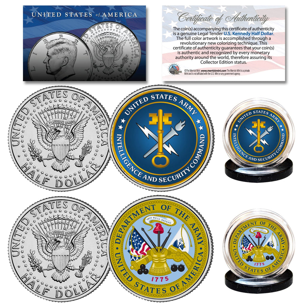 ARMY & USA INTELLIGENCE Branch JFK Half Dollar Armed Forces Military 2-Coin U.S. Set. The set comes with a Certificate of Authenticity to guaranty that your coins are authentic and recognized by every monetary authority around the world, assuring its Collector Edition status. Each coin comes in a premium coin capsule.
