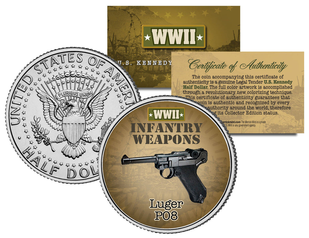 Here is your chance to own a beautifully colorized JFK Kennedy Half Dollar U.S. Coin featuring one of the most famous WORLD WAR II INFANTRY WEAPONS in the world, in the Limited Edition WWII Infantry Weapons Coin Series. Each coin comes in a premium coin capsule with a full color Certificate of Authenticity. This official high-quality genuine Legal Tender United States Coin has been colorized using a unique multicolor authentic process. Colorizing coins involves the unique application of special inks directly to the surface of a coin using a unique and painstakingly multicolor coin process, that achieves a level of detail, color saturation, and durability that is #1 in the industry. The result is an everlasting colorized coin collectible of ultra-high quality.