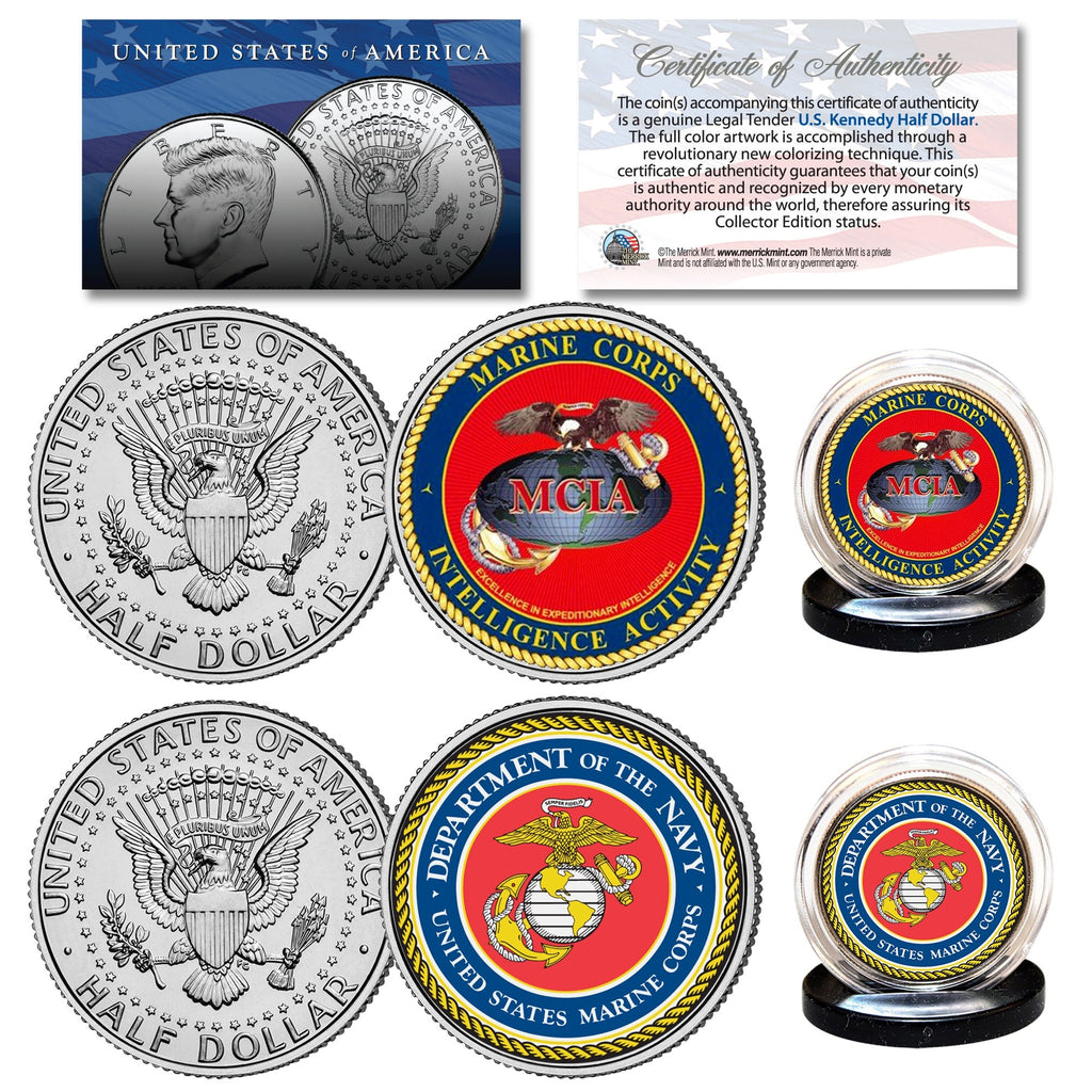 MARINES & USMC INTELLIGENCE Branch JFK Half Dollar Armed Forces Military 2-Coin U.S. Set. The set comes with a Certificate of Authenticity to guaranty that your coins are authentic and recognized by every monetary authority around the world, assuring its Collector Edition status. Each coin comes in a premium coin capsule.