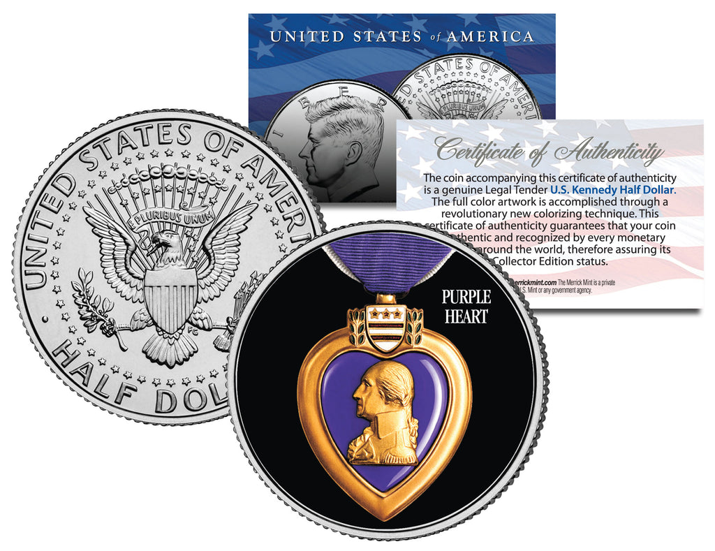 The Purple Heart is a United States military decoration awarded in the name of the President to those wounded or killed, while serving, on or after April 5, 1917, with the U.S. military. This PURPLE HEART MEDAL coin is a treasured collectible, combining military medals collecting with coin collecting. Here is your chance to own a beautifully colorized JFK Kennedy Half Dollar U.S. Coin. This high-quality genuine Legal Tender U.S. coin has been colorized using a unique painstaking multicolor authentic process by the Merrick Mint. Colorizing coins involves the unique application of special inks directly to the surface of a coin that achieves a level of detail, color saturation, and durability that is #1 in the coin industry. The result is an everlasting colorized coin collectible of ultra-high quality. Each coin comes in a premium coin capsule with a Certificate of Authenticity to guaranty that your coin is authentic and recognized by every monetary authority around the world, assuring its Collector Edition status. The Kennedy half dollar is a U.S. fifty cent coin with coin year and mint marks chosen at random.