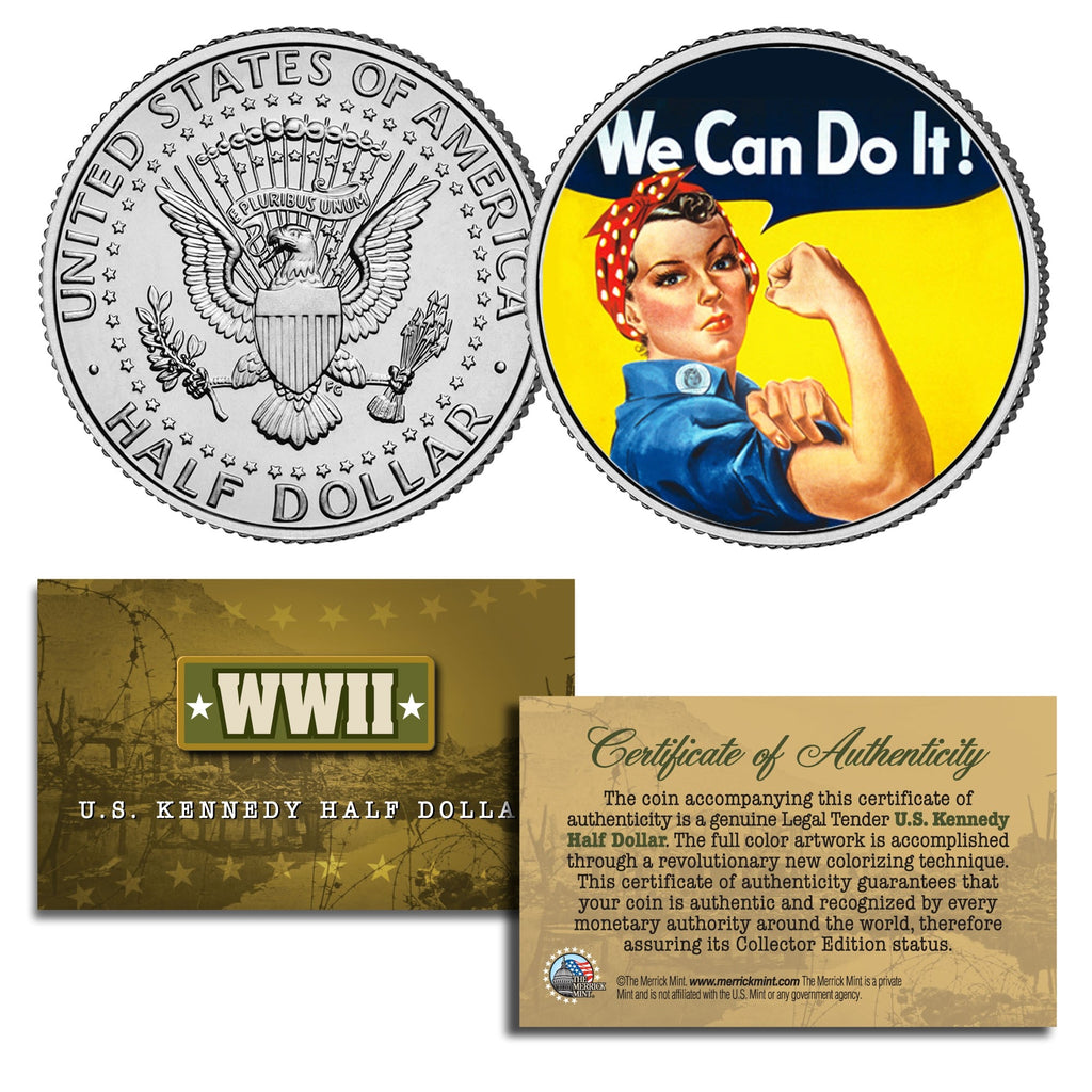Here is your opportunity to own or gift the “WE CAN DO IT!” colorized JFK Kennedy Half Dollar U.S. Coin, which has been enhanced with a beautifully colorized image by the Merrick Mint. Each coin comes in a premium coin capsule with a full color Certificate of Authenticity to guarantee that your coin is authentic and recognized by every monetary authority around the world. This Legal Tender United States coin has been colorized with an application of special inks directly to the surface of the coin, using a unique and painstakingly multicolor coin process, which achieves a level of detail, color saturation, and durability that is #1 in the coin industry. The result is an everlasting colorized coin collectible of ultra-high quality. The Kennedy half dollar is a U.S. fifty cent coin with coin year and mint marks chosen at random.