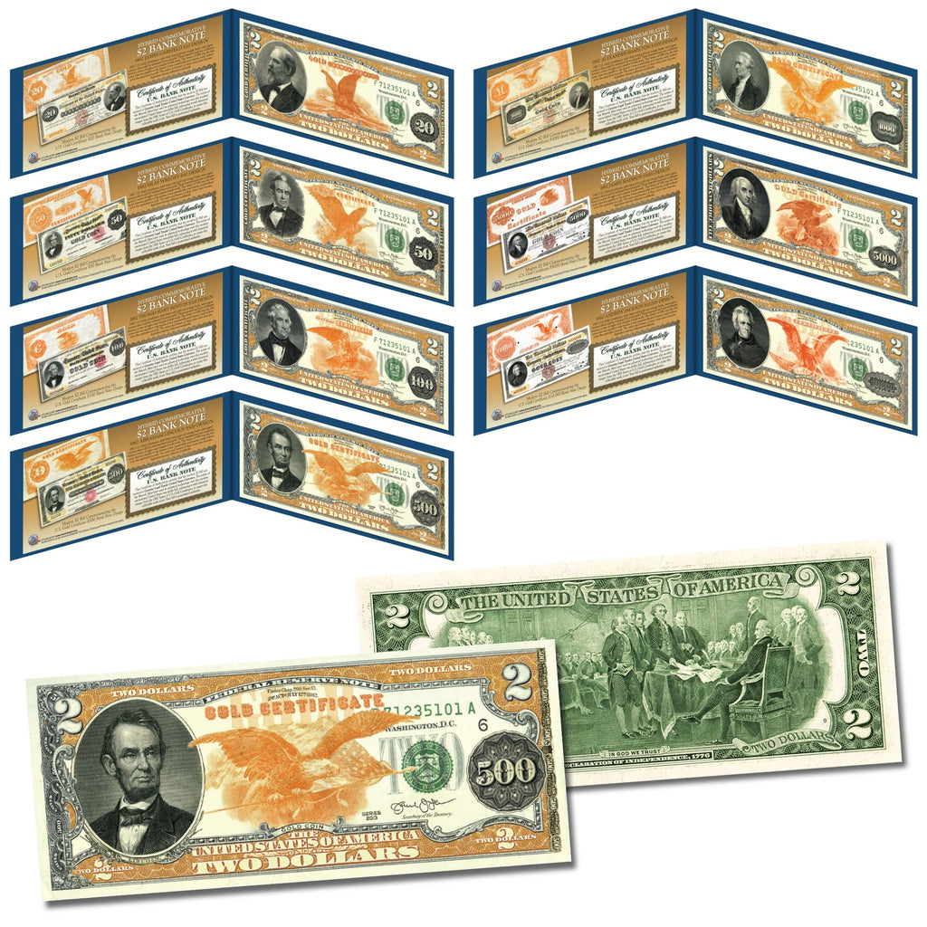 Here is your chance to own the complete set of seven 1882 Series Gold Certificates designed on Modern $2 Bills. Original 1882 U.S. Gold Certificates, with their vivid gold and orange backs, were paper currency that could be redeemed for actual gold. These beautiful and rare certificates feature a series of eagles and complex border work. The Series of 1882 was the first series that was payable to the bearer; it was transferable and anyone could redeem it for the equivalent in gold. The rarity and beauty of these notes have become legendary among collectors worldwide. These bills are very rare and the originals can only usually be found in auction, selling for thousands and sometimes millions of dollars. Some only have a few pieces in existence, which are only in the Smithsonian Museum. Now is your chance to collect them all on new Genuine Legal Tender $2 Bills. The artists of the Merrick Mint have used an advanced technology over these modern uncirculated United States Two-Dollar bills, enhancing them with the historical images from the 1882 Series of U.S. Gold Certificates, to create this collectible work of art.
