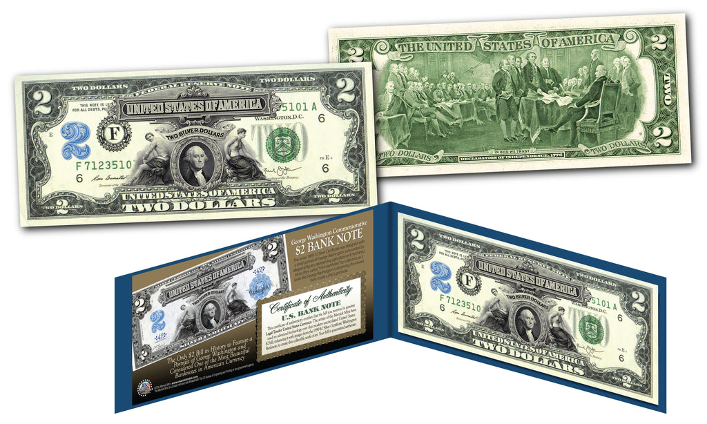 The series 1899 $2 Silver Certificate was designed with a small portrait of George Washington surrounded by allegorical figures, representing agriculture and mechanics. Most often called "mini-portholes" by collectors, as it looks like George Washington is observing the viewer from inside a ship's porthole. The only $2 Bill in history to feature a portrait of George Washington and considered one of the most beautiful banknotes in American Currency. The artists of the Merrick Mint have used an advanced technology over this modern uncirculated United States $2 bill, enhancing it with images from the 1899 $2 Silver Certificate Washington Banknote, to create a collectible work of art.