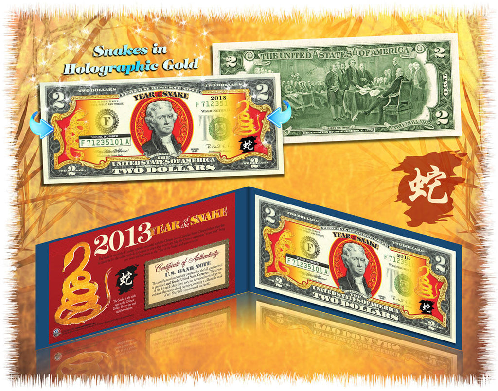 This is an opportunity to acquire a true Collector’s Item, a genuine U.S. $2 Bill that is enhanced with a special colorization process by The Merrick Mint. This bill is enhanced with Holographic Gold images of the snake to represent the Chinese Year of the Snake. Never before has a $2 bill been enhanced with colorization, making it the most ornate and historically attractive piece of U.S. currency. Only genuine Legal Tender $2 United States Bills are used for this unique colorization process. Each $2 Bill is in FRESH, CRISP, UNCIRCULATED condition, and was directly removed from untouched wrapped Federal Reserve sealed packs. Former U.S. President Thomas Jefferson is featured on the obverse of the note, along with the special colorization overlay. The Signing of the Declaration of Independence by John Trumbull is featured on the reverse. It is the only U.S. Currency note that features two Presidents, John Adams and Thomas Jefferson, and it is one of the most rarely seen BILLS in circulation and actual use. The colorization is of the highest quality, which is made possible only through new colorized technology developed by The Merrick Mint.