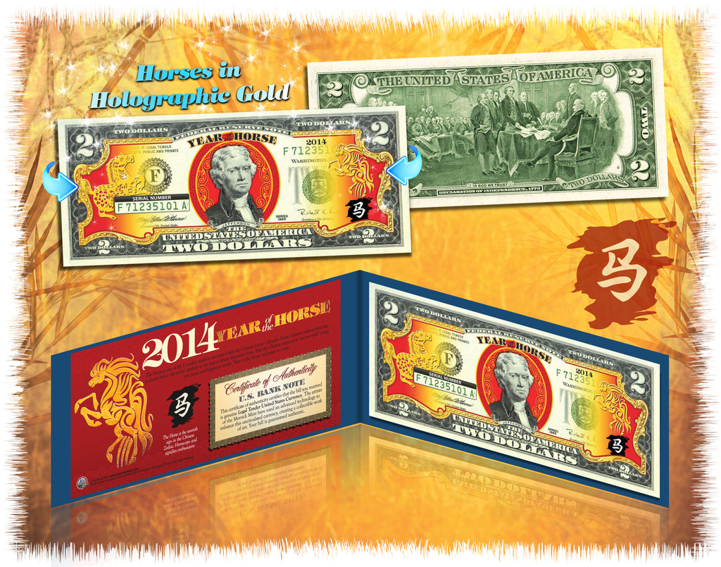 This is an opportunity to acquire a true Collector’s Item, a genuine U.S. $2 Bill that is enhanced with a special colorization process by The Merrick Mint. This bill is enhanced with Holographic Gold images of the Horses to represent the Chinese Year of the Horse. Never before has a $2 bill been enhanced with colorization, making it the most ornate and historically attractive piece of U.S. currency. Only genuine Legal Tender $2 United States Bills are used for this unique colorization process. Each $2 Bill is in FRESH, CRISP, UNCIRCULATED condition, and was directly removed from untouched wrapped Federal Reserve sealed packs. Former U.S. President Thomas Jefferson is featured on the obverse of the note, along with the special colorization overlay. The Signing of the Declaration of Independence by John Trumbull is featured on the reverse. It is the only U.S. Currency note that features two Presidents, John Adams and Thomas Jefferson, and it is one of the most rarely seen BILLS in circulation and actual use. The colorization is of the highest quality, which is made possible only through new colorized technology developed by The Merrick Mint.