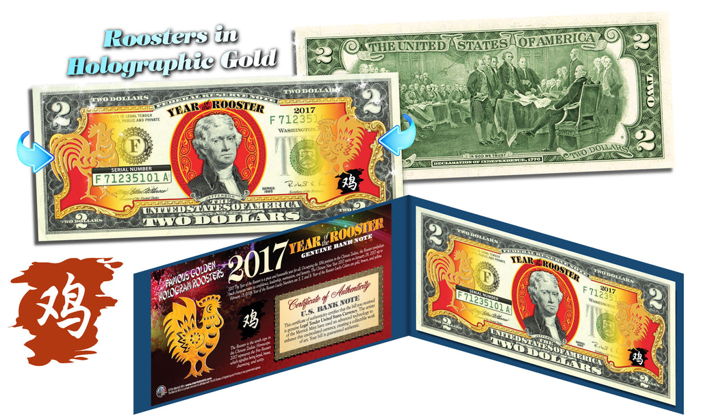 This is the original 2017 Chinese New Year $2 Bill in Blue deluxe Folio. This is an opportunity to acquire a true Collector’s Item, a GENUINE LEGAL TENDER U.S. $2 Bill that is enhanced with a special Colorization process by The Merrick Mint. This bill is enhanced with Holographic Gold images of ROOSTER's to represent the 2017 Chinese Year of the Rooster. Never before has a $2 bill been enhanced with colorization, making it the most ornate and historically attractive piece of U.S. currency. Each $2 Bill is in FRESH, CRISP, UNCIRCULATED condition, and was directly removed from untouched wrapped Federal Reserve sealed packs. Former U.S. President Thomas Jefferson is featured on the obverse of the note, along with the special colorization overlay. The Signing of the Declaration of Independence by John Trumbull is featured on the reverse. It is the only U.S. Currency note that features two Presidents, John Adams and Thomas Jefferson, and it is one of the most rarely seen bills in circulation and actual use. This New Year, give a gift of good fortune to family and friends with the famous Golden Hologram 2017 Chinese New Year Rooster $2 U.S. Bill. Place your order now as they are In-Stock and Shipping immediately. SPECIAL LOW PRICE: $13.95. We also ship internationally.
