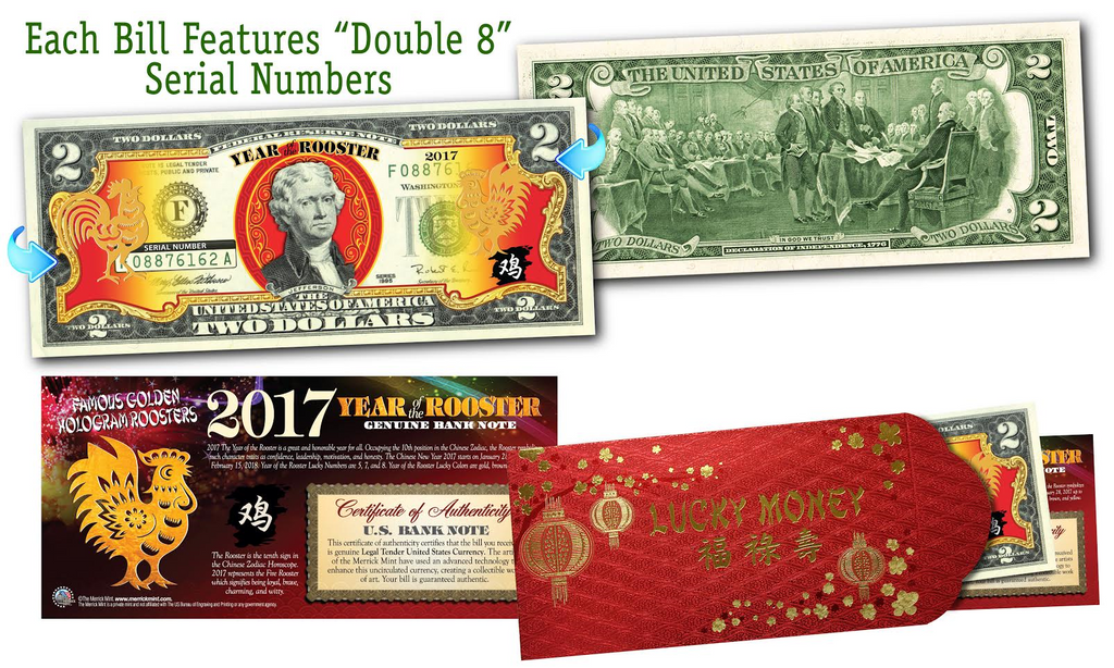This is the original 2017 Chinese New Year $2 Bill. This special lucky year of 2017 has been updated with a premium Red Envelope that is hand made with a special Lunar Red and Gold Leaf. The deluxe envelope is a premium edition made with ultra-high quality materials. This is an opportunity to acquire a true Collector’s Item, a GENUINE LEGAL TENDER U.S. $2 Bill that is enhanced with a special Colorization process by The Merrick Mint. This bill is enhanced with Holographic Gold images of ROOSTER's to represent the 2017 Chinese Year of the Rooster. Never before has a $2 bill been enhanced with colorization, making it the most ornate and historically attractive piece of U.S. currency. Each $2 Bill is in FRESH, CRISP, UNCIRCULATED condition, and was directly removed from untouched wrapped Federal Reserve sealed packs. Former U.S. President Thomas Jefferson is featured on the obverse of the note, along with the special colorization overlay. The Signing of the Declaration of Independence by John Trumbull is featured on the reverse. It is the only U.S. Currency note that features two Presidents, John Adams and Thomas Jefferson, and it is one of the most rarely seen bills in circulation and actual use. This New Year, give a gift of good fortune to family and friends with the famous Golden Hologram 2017 Chinese New Year Rooster $2 U.S. Bill. Place your order now as they are In-Stock and Shipping immediately. SPECIAL LOW PRICE: $19.95. We also ship internationally.