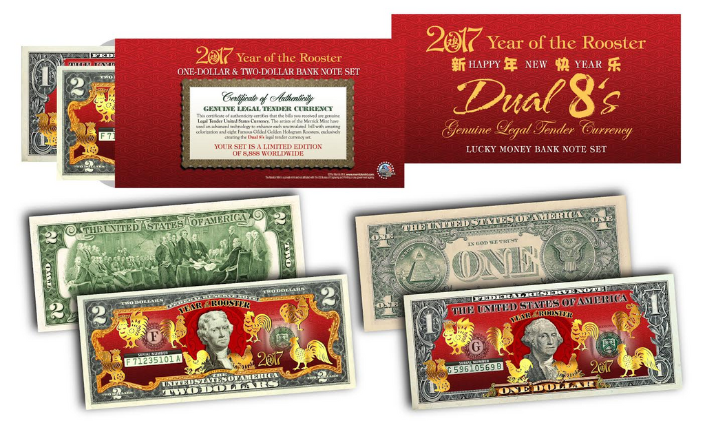 Limited Release, Special Issue - The Rooster is one of 12 zodiac symbols associated with the Chinese Lunar Calendar. Some people believe their fate is closely tied to the zodiac symbols in the year in which they were born. This Lucky Money Note Set contains a Genuine Legal Tender Federal Reserve uncirculated $1 note and uncirculated $2 note…both magnificently featuring 8 Gold Matching Rooster's in Holographic Gold. This product is limited to 8,888 sets worldwide. To further enrich this product, the Set of 2 U.S. “Year of the Rooster” Gold Matching Dual 8’s Legal Tender Bills come packaged together in an exclusive Red Envelope with beautiful Gold Leaf stamping which is a symbol of energy, happiness, and good luck. This New Year, give a gift of good fortune to family and friends with the Dual 8’s Lucky Money Note Set, which is enclosed in an attractive Red folder festively adorned with Chinese symbolism, capturing the significance of the New Year. May the “Year of the Rooster” note set bring you the ultimate luck. This is the most limited set ever produced and the luck it will bring will be of great fortune and success.