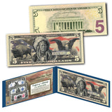 This Americana Images of Historical U.S. Currency uncirculated U.S. $5 Bill is Genuine Authentic Legal Tender of the United States, which has been enhanced with beautiful colorized images. This bill features three images of some of the most historical symbols that created America - the Buffalo Bison, the Black Eagle, and the Native American Indian Chief. The Eagle is the symbol of Courage, Strength and Victory. The Bison, once hunted to the brink of extinction in America, is the first national mammal of the US. The colorized images are accomplished through a revolutionary new authentic & genuine colorization process pioneered by The Merrick Mint, creating a collectible work of art. Each bill comes displayed in a blue folio with a Certificate of Authenticity to guarantee that your bills are authentic and recognized by every monetary authority around the world, therefore assuring its Collector Edition status. Each $5 Bill is in FRESH, CRISP, UNCIRCULATED condition, and was directly removed from untouched wrapped Federal Reserve sealed packs.