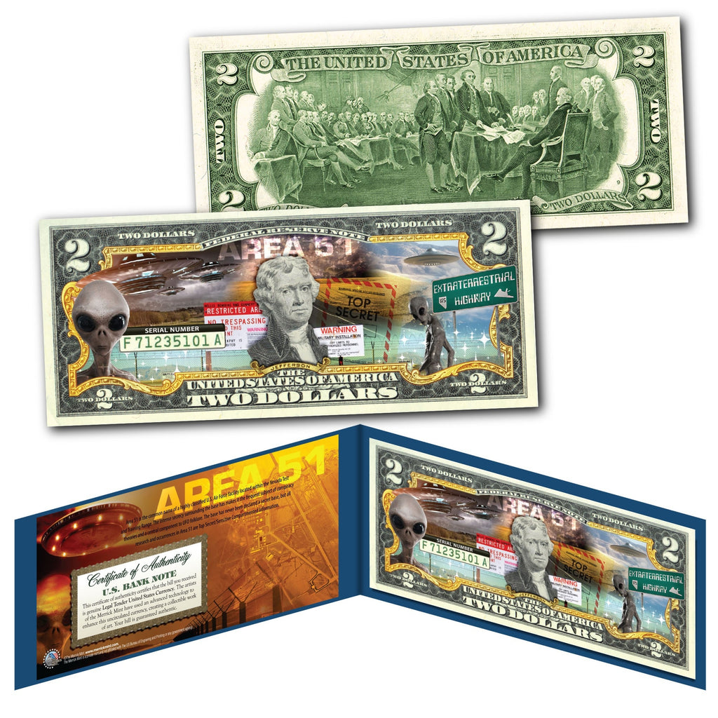 This AREA 51 uncirculated U.S. $2 Bill is Genuine Authentic Legal Tender of the United States, which has been enhanced with beautiful colorized images. Area 51 is the common name of a highly classified U.S. Air Force facility located within the Nevada Test and Training Range. The intense secrecy surrounding the base makes it the frequent subject of conspiracy theories and a central component to UFO folklore. The base has never been declared a secret base, but all research and occurrences in Area 51 are Top Secret/Sensitive Compartmented information. The colorized images are accomplished through a revolutionary new authentic & genuine colorization process pioneered by The Merrick Mint, creating a collectible work of art. Each bill comes displayed in a blue folio with a Certificate of Authenticity to guarantee that your bills are authentic and recognized by every monetary authority around the world, therefore assuring its Collector Edition status. Each $2 Bill is in FRESH, CRISP, UNCIRCULATED condition, and was directly removed from untouched wrapped Federal Reserve sealed packs. Former U.S. President Thomas Jefferson is featured on the obverse of the note, along with the special colorization overlay. The Signing of the Declaration of Independence by John Trumbull is featured on the reverse. It is the only U.S. Currency note that features two Presidents, John Adams and Thomas Jefferson, and it is one of the most rarely seen BILLS in circulation and actual use.