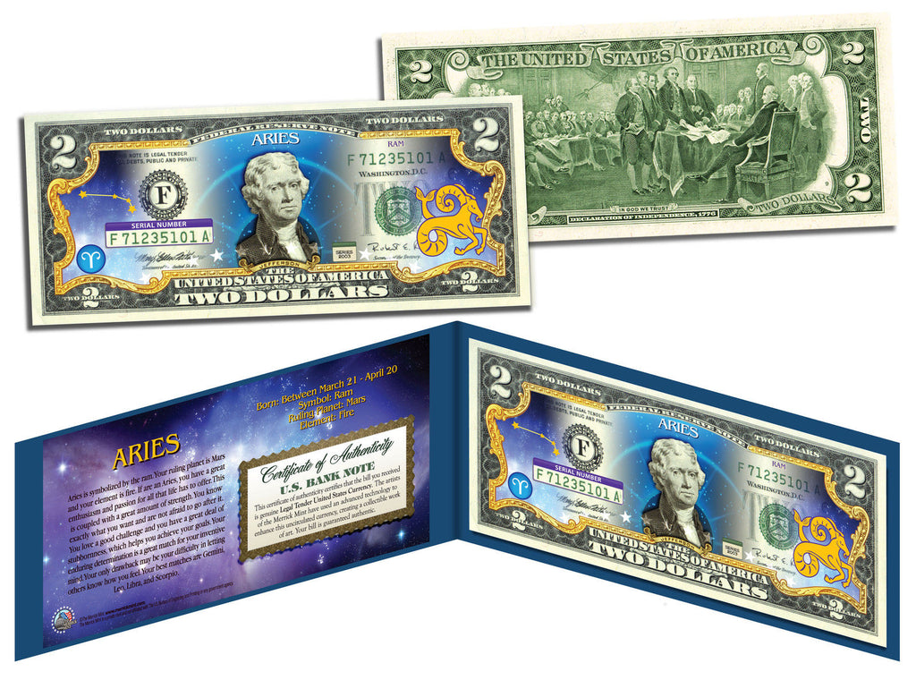 • ARIES - Horoscope Zodiac - Genuine Legal Tender Colorized U.S. $2 Bill