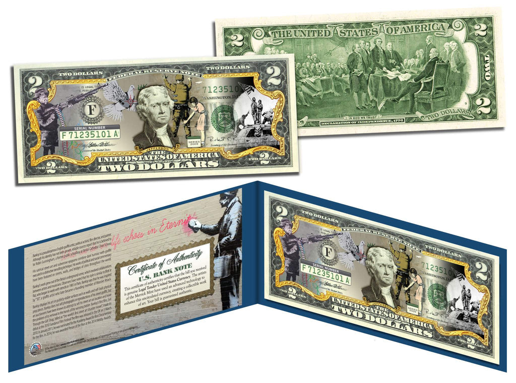 A great gift, this BANKSY - ANTI-WAR uncirculated U.S. $2 Bill is Genuine Authentic Legal Tender of the United States, which has been enhanced with colorized images. The colorized images are accomplished through a revolutionary new authentic & genuine colorization process pioneered by The Merrick Mint, creating a collectible work of art. Each bill comes displayed in a blue folio with a Certificate of Authenticity to guarantee that your bills are authentic and recognized by every monetary authority around the world, therefore assuring its Collector Edition status. Each $2 Bill is in FRESH, CRISP, UNCIRCULATED condition, and was directly removed from untouched wrapped Federal Reserve sealed packs. Former U.S. President Thomas Jefferson is featured on the obverse of the note, along with the special colorization overlay. The Signing of the Declaration of Independence by John Trumbull is featured on the reverse. It is the only U.S. Currency note that features two Presidents, John Adams and Thomas Jefferson, and it is one of the most rarely seen BILLS in circulation and actual use.