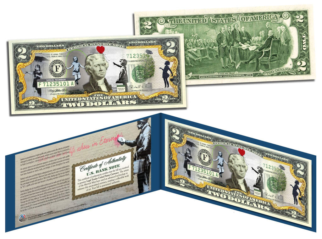 A great gift, this BANKSY - GIRLS uncirculated U.S. $2 Bill is Genuine Authentic Legal Tender of the United States, which has been enhanced with colorized images. The colorized images are accomplished through a revolutionary new authentic & genuine colorization process pioneered by The Merrick Mint, creating a collectible work of art. Each bill comes displayed in a blue folio with a Certificate of Authenticity to guarantee that your bills are authentic and recognized by every monetary authority around the world, therefore assuring its Collector Edition status. Each $2 Bill is in FRESH, CRISP, UNCIRCULATED condition, and was directly removed from untouched wrapped Federal Reserve sealed packs. Former U.S. President Thomas Jefferson is featured on the obverse of the note, along with the special colorization overlay. The Signing of the Declaration of Independence by John Trumbull is featured on the reverse. It is the only U.S. Currency note that features two Presidents, John Adams and Thomas Jefferson, and it is one of the most rarely seen BILLS in circulation and actual use.