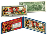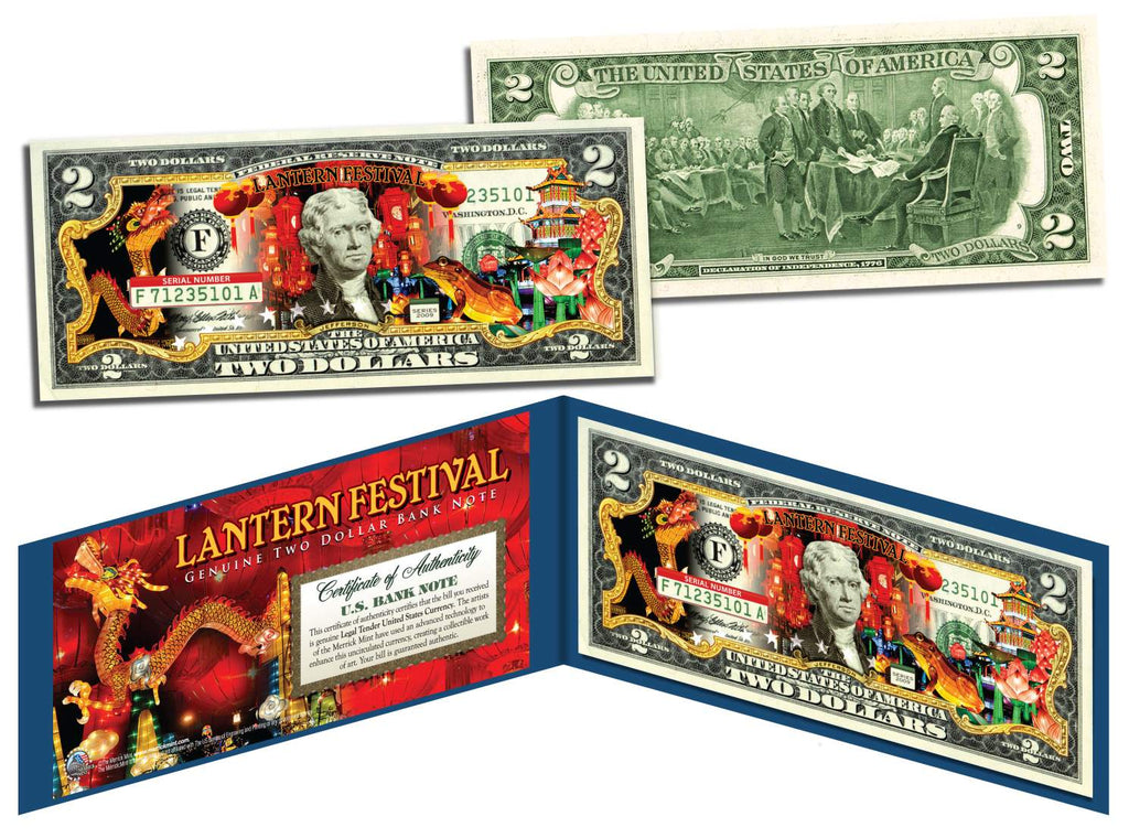 Lantern Festival is celebrated on the 15th day of the first month of traditional Chinese calendar. This LANTERN FESTIVAL uncirculated U.S. $2 Bill is Genuine Authentic Legal Tender of the United States, which has been enhanced with beautiful colorized images. The colorized images are accomplished through a revolutionary new authentic & genuine colorization process pioneered by The Merrick Mint, creating a collectible work of art. Each bill comes displayed in a blue folio with a Certificate of Authenticity to guarantee that your bills are authentic and recognized by every monetary authority around the world, therefore assuring its Collector Edition status. Each $2 Bill is in FRESH, CRISP, UNCIRCULATED condition, and was directly removed from untouched wrapped Federal Reserve sealed packs. Former U.S. President Thomas Jefferson is featured on the obverse of the note, along with the special colorization overlay. The Signing of the Declaration of Independence by John Trumbull is featured on the reverse. It is the only U.S. Currency note that features two Presidents, John Adams and Thomas Jefferson, and it is one of the most rarely seen BILLS in circulation and actual use.