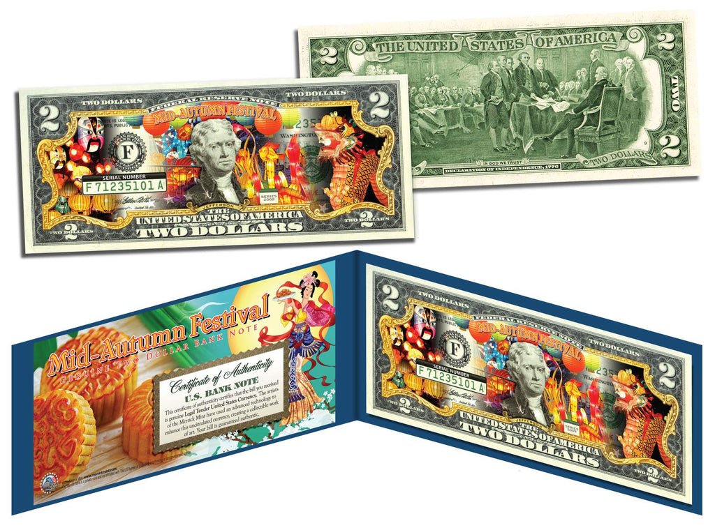 The Mid-Autumn Festival is a harvest festival celebrated by ethnic Chinese and Vietnamese peoples. Mid-Autumn Festival is sometimes used to describe Chuseok in Korea and Tsukimi in Japan. This MID-AUTUMN FESTIVAL uncirculated U.S. $2 Bill is Genuine Authentic Legal Tender of the United States, which has been enhanced with beautiful colorized images. The colorized images are accomplished through a revolutionary new authentic & genuine colorization process pioneered by The Merrick Mint, creating a collectible work of art. Each bill comes displayed in a blue folio with a Certificate of Authenticity to guarantee that your bills are authentic and recognized by every monetary authority around the world, therefore assuring its Collector Edition status. Each $2 Bill is in FRESH, CRISP, UNCIRCULATED condition, and was directly removed from untouched wrapped Federal Reserve sealed packs. Former U.S. President Thomas Jefferson is featured on the obverse of the note, along with the special colorization overlay. The Signing of the Declaration of Independence by John Trumbull is featured on the reverse. It is the only U.S. Currency note that features two Presidents, John Adams and Thomas Jefferson, and it is one of the most rarely seen BILLS in circulation and actual use.