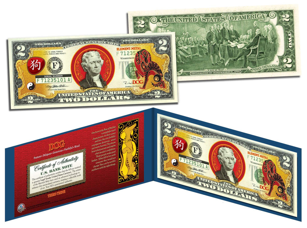 A great gift, this CHINESE ZODIAC – YEAR OF THE DOG uncirculated U.S. $2 Bill is Genuine Authentic Legal Tender of the United States, which has been enhanced with colorized images. The colorized images are accomplished through a revolutionary new authentic & genuine colorization process pioneered by The Merrick Mint, creating a collectible work of art. Each bill comes displayed in a blue folio with a Certificate of Authenticity to guarantee that your bills are authentic and recognized by every monetary authority around the world, therefore assuring its Collector Edition status. Each $2 Bill is in FRESH, CRISP, UNCIRCULATED condition, and was directly removed from untouched wrapped Federal Reserve sealed packs. Former U.S. President Thomas Jefferson is featured on the obverse of the note, along with the special colorization overlay. The Signing of the Declaration of Independence by John Trumbull is featured on the reverse. It is the only U.S. Currency note that features two Presidents, John Adams and Thomas Jefferson, and it is one of the most rarely seen BILLS in circulation and actual use.