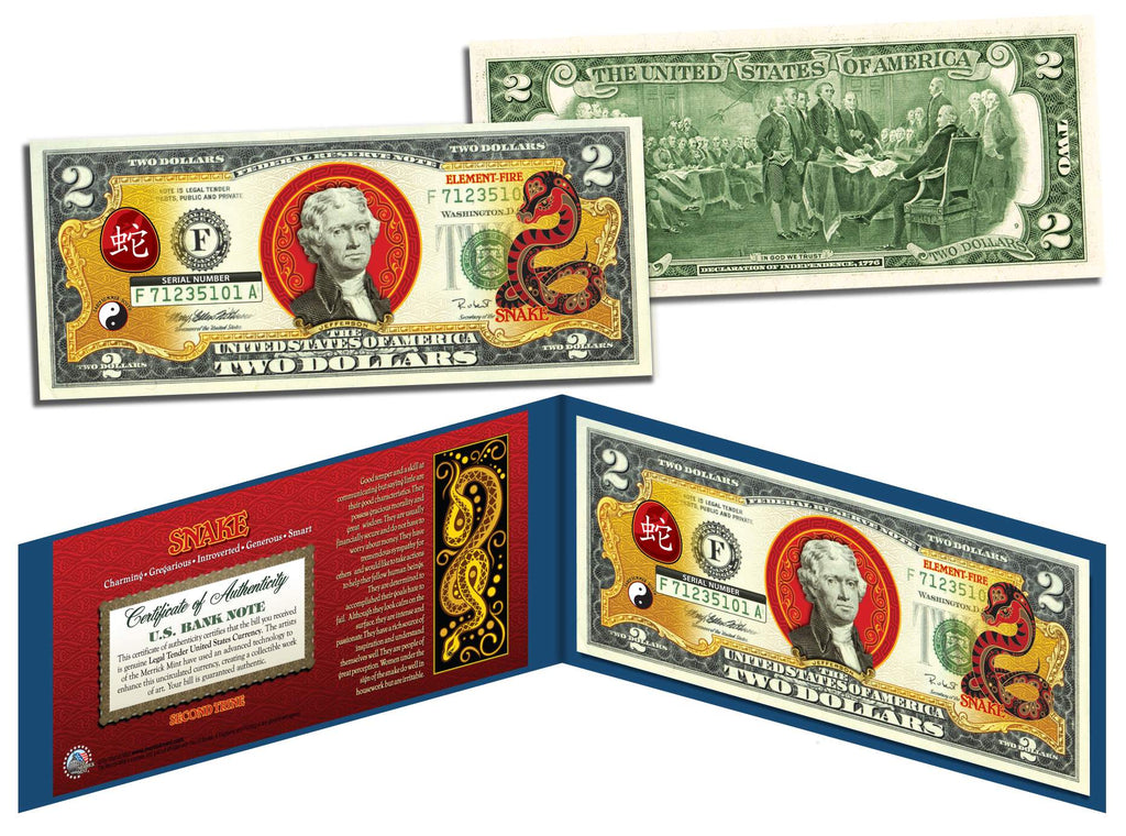 A great gift, this CHINESE ZODIAC – YEAR OF THE SNAKE uncirculated U.S. $2 Bill is Genuine Authentic Legal Tender of the United States, which has been enhanced with colorized images. The colorized images are accomplished through a revolutionary new authentic & genuine colorization process pioneered by The Merrick Mint, creating a collectible work of art. Each bill comes displayed in a blue folio with a Certificate of Authenticity to guarantee that your bills are authentic and recognized by every monetary authority around the world, therefore assuring its Collector Edition status. Each $2 Bill is in FRESH, CRISP, UNCIRCULATED condition, and was directly removed from untouched wrapped Federal Reserve sealed packs. Former U.S. President Thomas Jefferson is featured on the obverse of the note, along with the special colorization overlay. The Signing of the Declaration of Independence by John Trumbull is featured on the reverse. It is the only U.S. Currency note that features two Presidents, John Adams and Thomas Jefferson, and it is one of the most rarely seen BILLS in circulation and actual use.