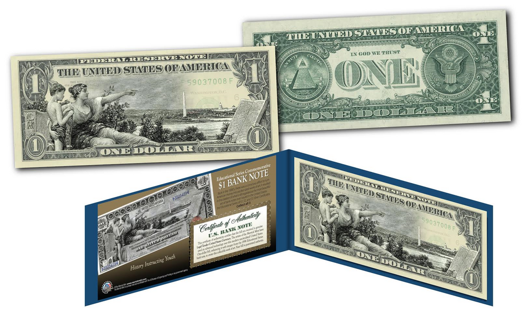 This EDUCATIONAL SERIES uncirculated One-Dollar Bill is Genuine Legal Tender of the United States, which has been enhanced with beautiful colorized images . The full colorized images are accomplished through a revolutionary new authentic & genuine colorization process pioneered by The Merrick Mint, creating a collectible work of art. In the 1890’s, there was a conscious effort to turn American money into pocket-sized works of art, which resulted in the creation of what is still regarded as the most beautiful set of bank notes ever issued in the United States: The Educational Series of $1, $2 and $5 Silver Certificates. The obverse of the notes depict a neoclassical allegorical motif, which dominates the front of the note. The motif of the $1 Bill is a representation of the theme “History Instructing Youth". Included is a blue display portfolio plus a Certificate of Authenticity to guarantee that your bill is authentic and recognized by every monetary authority around the world, and assuring its Collector Edition status. Only genuine Legal Tender $1 United States Bills are used for this unique colorization process. Each $1 Bill is in FRESH, CRISP, UNCIRCULATED condition, and was directly removed from untouched wrapped Federal Reserve sealed packs. The first U.S. President, George Washington , is featured on the obverse, along with the special colorization overlay. The Great Seal of the United States is featured on the reverse.