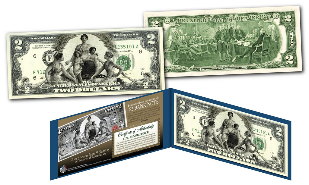 This EDUCATIONAL SERIES uncirculated Two-Dollar Bill is Genuine Legal Tender of the United States, which has been enhanced with beautiful colorized images. In the 1890’s, there was a conscious effort to turn American money into pocket-sized works of art, which resulted in the creation of what is still regarded as the most beautiful set of bank notes ever issued in the United States: The Educational Series of $1, $2 and $5 Silver Certificates. The obverse of the notes depict a neoclassical allegorical motif, which dominates the front of the note. The motif of the $2 Bill is a representation of the theme “Science presenting steam and electricity to Commerce and Manufacture.The full colorized images are accomplished through a revolutionary new authentic & genuine colorization process pioneered by The Merrick Mint. Included is a Certificate of Authenticity to guarantee that your bills are authentic and recognized by every monetary authority around the world, and assuring its Collector Edition status. Only genuine Legal Tender $2 United States Bills are used for this unique colorization process. Each $2 Bill is in FRESH, CRISP, UNCIRCULATED condition, and was directly removed from untouched wrapped Federal Reserve sealed packs. Former U.S. President Thomas Jefferson is featured on the obverse of the note, along with the special colorization overlay. The Signing of the Declaration of Independence by John Trumbull is featured on the reverse. It is the only U.S. Currency note that features two Presidents, John Adams and Thomas Jefferson, and it is one of the most rarely seen BILLS in circulation and actual use.