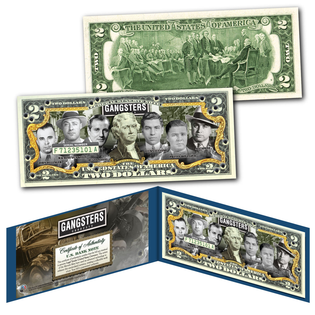 This GANGSTERS uncirculated $2 Bill is Genuine Authentic Legal Tender of the United States, which has been enhanced with beautiful colorized images. The full colorized images are accomplished through a revolutionary new authentic & genuine colorization process pioneered by The Merrick Mint. Included is a Certificate of Authenticity to guarantee that your bills are authentic and recognized by every monetary authority around the world, and assuring its Collector Edition status. Only genuine Legal Tender $2 United States Bills are used for this unique colorization process. Each $2 Bill is in FRESH, CRISP, UNCIRCULATED condition, and was directly removed from untouched wrapped Federal Reserve sealed packs. Former U.S. President Thomas Jefferson is featured on the obverse of the note, along with the special colorization overlay. The Signing of the Declaration of Independence by John Trumbull is featured on the reverse. It is the only U.S. Currency note that features two Presidents, John Adams and Thomas Jefferson, and it is one of the most rarely seen BILLS in circulation and actual use.