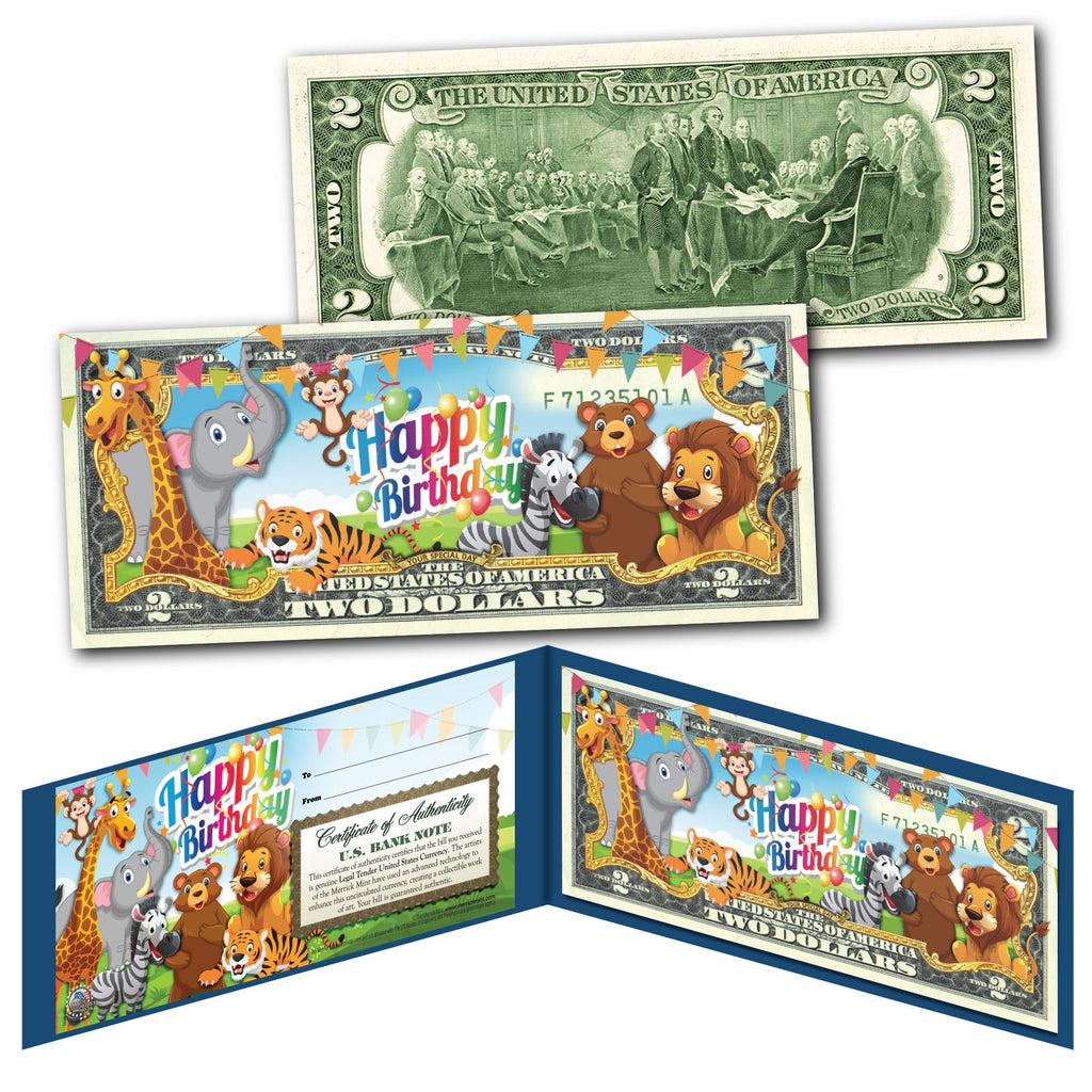 HAPPY BIRTHDAY Zoo Animals Youth Colorized $2 Bill U.S. Genuine Legal Tender with Folio