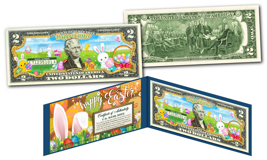 A great gift, this HAPPY EASTER uncirculated U.S. $2 Bill is Genuine Authentic Legal Tender of the United States, which has been enhanced with colorized images. The colorized images are accomplished through a revolutionary new authentic & genuine colorization process pioneered by The Merrick Mint, creating a collectible work of art. Each bill comes displayed in a blue folio with a Certificate of Authenticity to guarantee that your bills are authentic and recognized by every monetary authority around the world, therefore assuring its Collector Edition status. Each $2 Bill is in FRESH, CRISP, UNCIRCULATED condition, and was directly removed from untouched wrapped Federal Reserve sealed packs. Former U.S. President Thomas Jefferson is featured on the obverse of the note, along with the special colorization overlay. The Signing of the Declaration of Independence by John Trumbull is featured on the reverse. It is the only U.S. Currency note that features two Presidents, John Adams and Thomas Jefferson, and it is one of the most rarely seen BILLS in circulation and actual use.