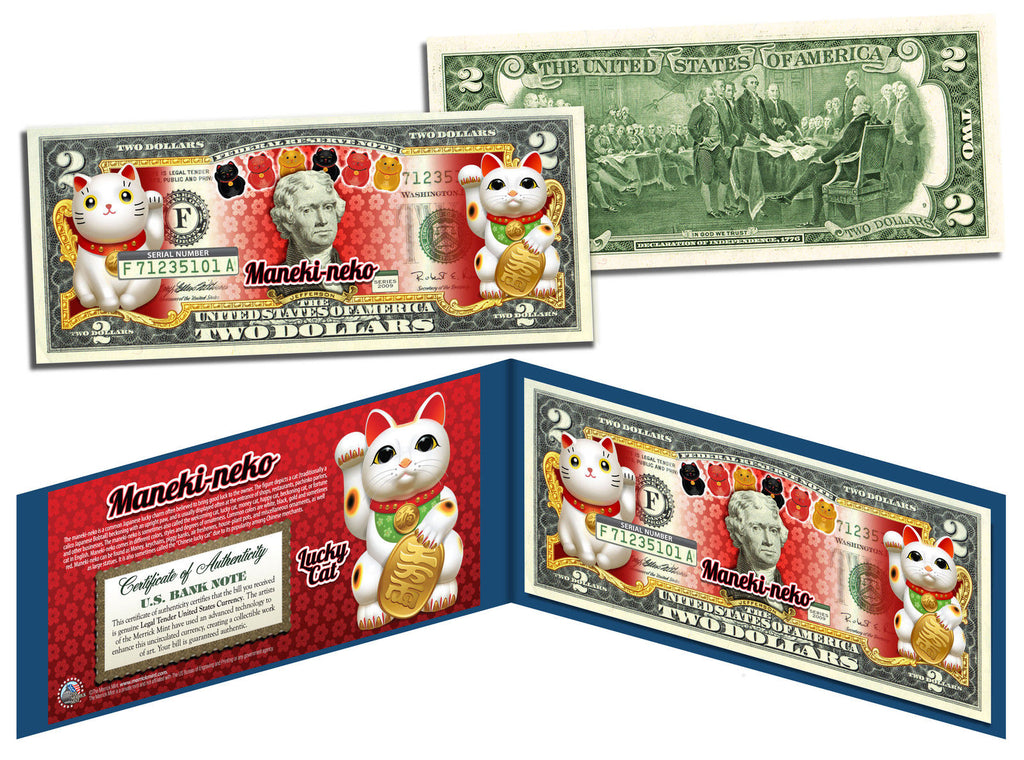 A great gift, this MANEKI NEKO LUCKY CAT uncirculated U.S. $2 Bill is Genuine Authentic Legal Tender of the United States, which has been enhanced with colorized images. The colorized images are accomplished through a revolutionary new authentic & genuine colorization process pioneered by The Merrick Mint, creating a collectible work of art. Each bill comes displayed in a blue folio with a Certificate of Authenticity to guarantee that your bills are authentic and recognized by every monetary authority around the world, therefore assuring its Collector Edition status. Each $2 Bill is in FRESH, CRISP, UNCIRCULATED condition, and was directly removed from untouched wrapped Federal Reserve sealed packs. Former U.S. President Thomas Jefferson is featured on the obverse of the note, along with the special colorization overlay. The Signing of the Declaration of Independence by John Trumbull is featured on the reverse. It is the only U.S. Currency note that features two Presidents, John Adams and Thomas Jefferson, and it is one of the most rarely seen BILLS in circulation and actual use.