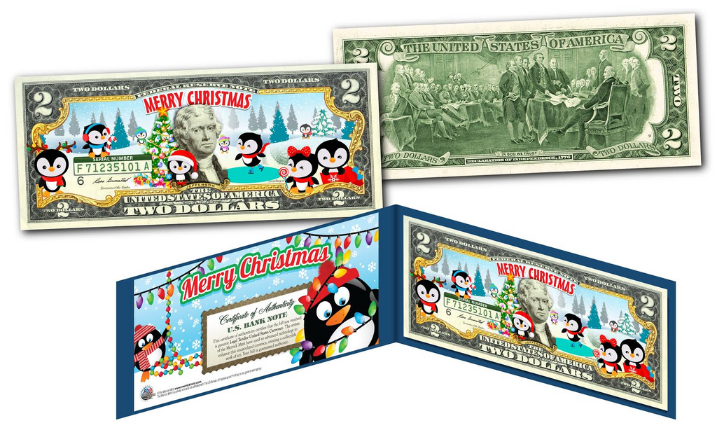 PENGUINS - MERRY CHRISTMAS XMAS Holiday Colorized Legal Tender U.S. $2 Bill with Certificate and Folio