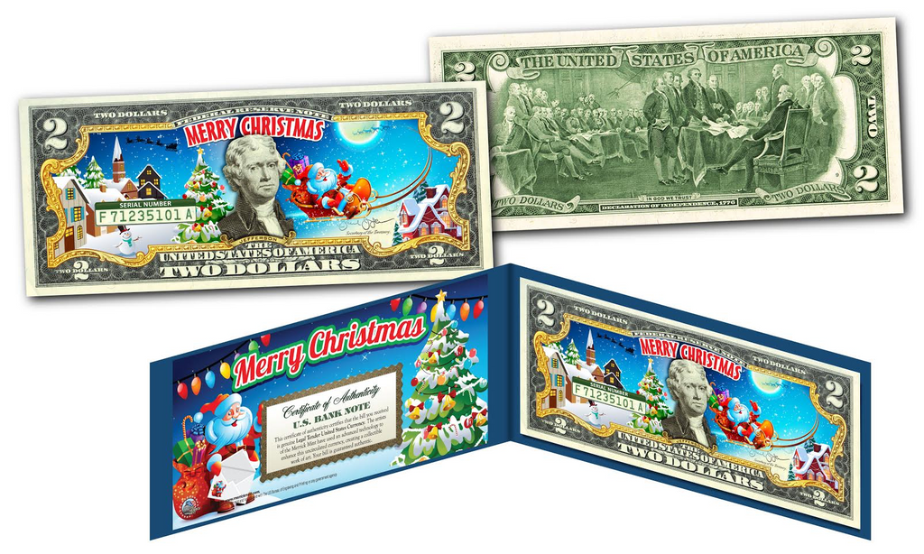 This MERRY CHRISTMAS uncirculated $2 Bill is Genuine Authentic Legal Tender of the United States, which has been enhanced with beautiful colorized images. The full colorized images are accomplished through a revolutionary new authentic & genuine colorization process pioneered by The Merrick Mint, creating a collectible work of art. Each bill comes displayed in a blue folio with a Certificate of Authenticity to guarantee that your bills are authentic and recognized by every monetary authority around the world, therefore assuring its Collector Edition status. Each $2 Bill is in FRESH, CRISP, UNCIRCULATED condition, and was directly removed from untouched wrapped Federal Reserve sealed packs. Former U.S. President Thomas Jefferson is featured on the obverse of the note, along with the special colorization overlay. The Signing of the Declaration of Independence by John Trumbull is featured on the reverse. It is the only U.S. Currency note that features two Presidents, John Adams and Thomas Jefferson, and it is one of the most rarely seen BILLS in circulation and actual use.