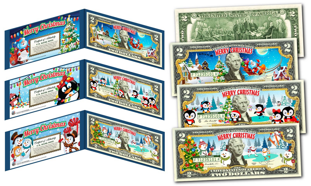 This MERRY CHRISTMAS (Set of 3) uncirculated $2 Bills are Genuine Authentic Legal Tender of the United States, which have been enhanced with beautiful colorized images. The full colorized images are accomplished through a revolutionary new authentic & genuine colorization process pioneered by The Merrick Mint, creating a collectible work of art. Each bill comes displayed in a blue folio with a Certificate of Authenticity to guarantee that your bills are authentic and recognized by every monetary authority around the world, therefore assuring its Collector Edition status. Each $2 Bill is in FRESH, CRISP, UNCIRCULATED condition, and was directly removed from untouched wrapped Federal Reserve sealed packs. Former U.S. President Thomas Jefferson is featured on the obverse of the note, along with the special colorization overlay. The Signing of the Declaration of Independence by John Trumbull is featured on the reverse. It is the only U.S. Currency note that features two Presidents, John Adams and Thomas Jefferson, and it is one of the most rarely seen BILLS in circulation and actual use.