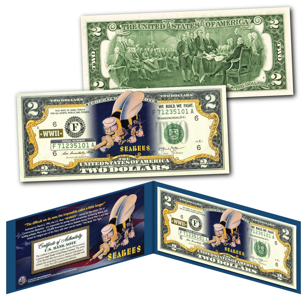 This Navy SEABEES uncirculated $2 Bill is Genuine Authentic Legal Tender of the United States, which has been enhanced with beautiful colorized images. Activated on March 5, 1942, the U.S. Navy "SEABEES" - named for the initials CB, or Construction Battalions - are responsible for paving roads and airstrips, bulldozing debris, and building airbases. More than 325,000 Americans served as Seabees during World War II, and they remain an integral part of the Navy with their can-do motto: "We Build. We Fight." The full colorized images are accomplished through a revolutionary new authentic & genuine colorization process pioneered by The Merrick Mint, creating a collectible work of art. Each bill comes displayed in a blue folio with a Certificate of Authenticity to guarantee that your bills are authentic and recognized by every monetary authority around the world, therefore assuring its Collector Edition status. Each $2 Bill is in FRESH, CRISP, UNCIRCULATED condition, and was directly removed from untouched wrapped Federal Reserve sealed packs. Former U.S. President Thomas Jefferson is featured on the obverse of the note, along with the special colorization overlay. The Signing of the Declaration of Independence by John Trumbull is featured on the reverse. It is the only U.S. Currency note that features two Presidents, John Adams and Thomas Jefferson, and it is one of the most rarely seen BILLS in circulation and actual use.