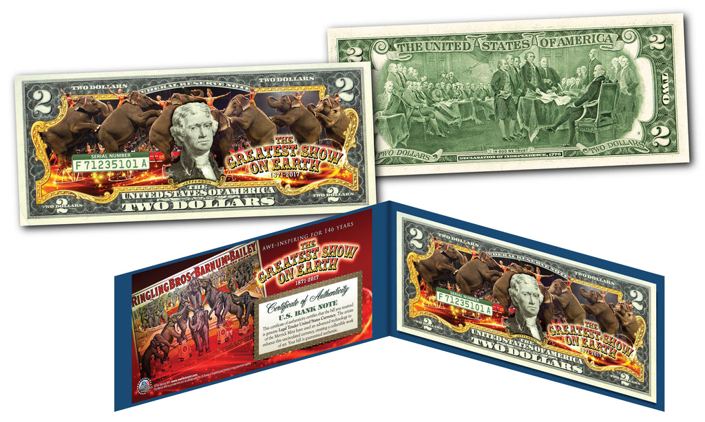 This RINGLING BROTHERS AND BARNUM & BAILEY Circus uncirculated $2 Bill is Genuine Authentic Legal Tender of the United States, which has been enhanced with beautiful colorized images. Ringling Bros. and Barnum & Bailey Circus is a United States traveling circus company billed as The Greatest Show on Earth. The circus, known as Ringling Bros. and Barnum & Bailey combined shows, features gravity-defying acrobats, orbital aerialists, majestic animals, fearless daredevils and humorous clowns. The iconic 146 year-old circus will hold its final performances in May 2017. The full colorized images are accomplished through a revolutionary new authentic & genuine colorization process pioneered by The Merrick Mint. Included is a Certificate of Authenticity to guarantee that your bills are authentic and recognized by every monetary authority around the world, and assuring its Collector Edition status. Only genuine Legal Tender $2 United States Bills are used for this unique colorization process. Each $2 Bill is in FRESH, CRISP, UNCIRCULATED condition, and was directly removed from untouched wrapped Federal Reserve sealed packs. Former U.S. President Thomas Jefferson is featured on the obverse of the note, along with the special colorization overlay. The Signing of the Declaration of Independence by John Trumbull is featured on the reverse. It is the only U.S. Currency note that features two Presidents, John Adams and Thomas Jefferson, and it is one of the most rarely seen BILLS in circulation and actual use.
