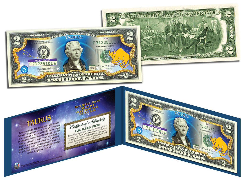 TAURUS - Horoscope Zodiac - Genuine Legal Tender Colorized U.S. $2 Bill