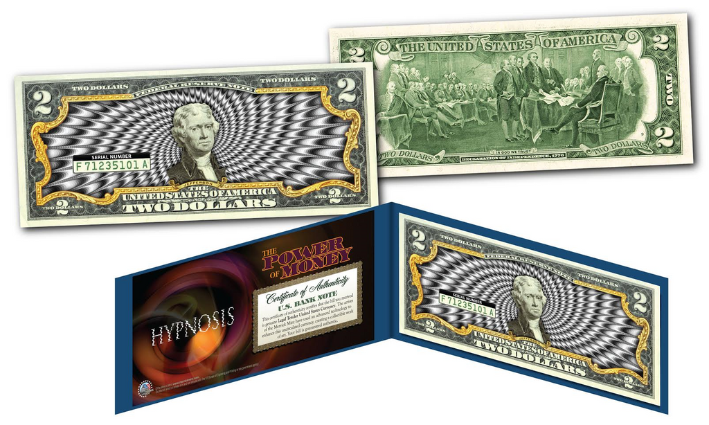 This Original HYPNOSIS The Power of Money uncirculated $2 Bill is Genuine Authentic Legal Tender of the United States, which has been enhanced with beautiful colorized images. The full colorized images are accomplished through a revolutionary new authentic & genuine colorization process pioneered by The Merrick Mint, creating a collectible work of art. Each bill comes displayed in a blue folio with a Certificate of Authenticity to guarantee that your bills are authentic and recognized by every monetary authority around the world, therefore assuring its Collector Edition status. Each $2 Bill is in FRESH, CRISP, UNCIRCULATED condition, and was directly removed from untouched wrapped Federal Reserve sealed packs. Former U.S. President Thomas Jefferson is featured on the obverse of the note, along with the special colorization overlay. The Signing of the Declaration of Independence by John Trumbull is featured on the reverse. It is the only U.S. Currency note that features two Presidents, John Adams and Thomas Jefferson, and it is one of the most rarely seen BILLS in circulation and actual use.