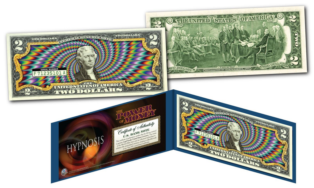 This Original HYPNOSIS The Power of Money Color uncirculated $2 Bill is Genuine Authentic Legal Tender of the United States, which has been enhanced with beautiful colorized images. The full colorized images are accomplished through a revolutionary new authentic & genuine colorization process pioneered by The Merrick Mint, creating a collectible work of art. Each bill comes displayed in a blue folio with a Certificate of Authenticity to guarantee that your bills are authentic and recognized by every monetary authority around the world, therefore assuring its Collector Edition status. Each $2 Bill is in FRESH, CRISP, UNCIRCULATED condition, and was directly removed from untouched wrapped Federal Reserve sealed packs. Former U.S. President Thomas Jefferson is featured on the obverse of the note, along with the special colorization overlay. The Signing of the Declaration of Independence by John Trumbull is featured on the reverse. It is the only U.S. Currency note that features two Presidents, John Adams and Thomas Jefferson, and it is one of the most rarely seen BILLS in circulation and actual use.