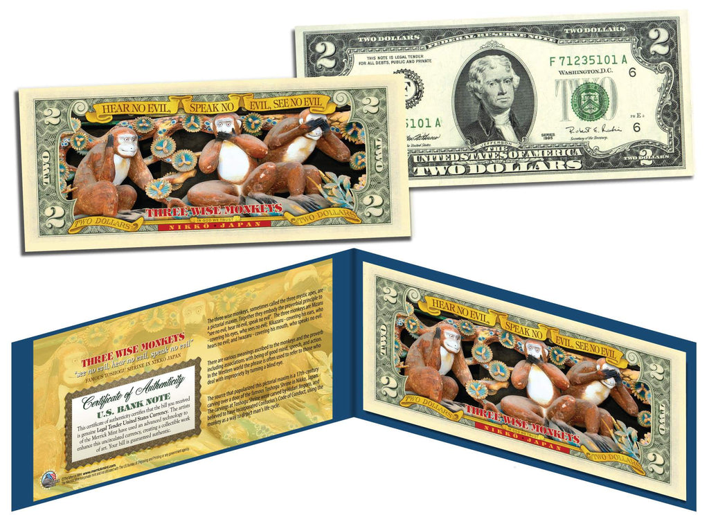 This THREE WISE MONKEYS – NIKKO JAPAN uncirculated U.S. $2 Bill is Genuine Authentic Legal Tender of the United States, which has been enhanced with beautiful colorized images. The full colorized images are accomplished through a revolutionary new authentic & genuine colorization process pioneered by The Merrick Mint, creating a collectible work of art. Each bill comes displayed in a blue folio with a Certificate of Authenticity to guarantee that your bills are authentic and recognized by every monetary authority around the world, therefore assuring its Collector Edition status. Each $2 Bill is in FRESH, CRISP, UNCIRCULATED condition, and was directly removed from untouched wrapped Federal Reserve sealed packs. Former U.S. President Thomas Jefferson is featured on the obverse of the note. The Signing of the Declaration of Independence by John Trumbull is featured on the reverse, along with the special colorization overlay. It is the only U.S. Currency note that features two Presidents, John Adams and Thomas Jefferson, and it is one of the most rarely seen BILLS in circulation and actual use.