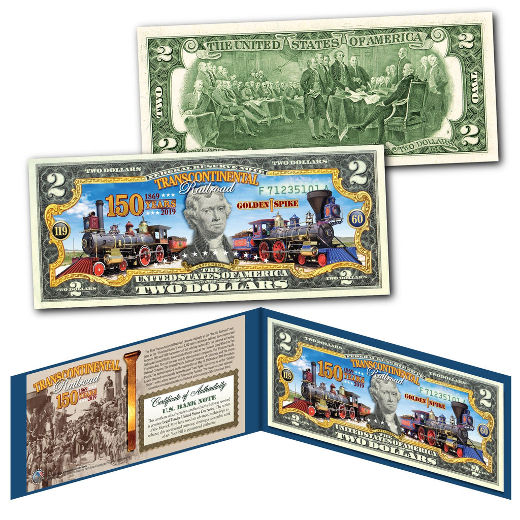 This TRANSCONTINENTAL RAILROAD uncirculated U.S. $2 Bill is Genuine Authentic Legal Tender of the United States, which has been enhanced with beautiful colorized images. The First Transcontinental Railroad (known originally as the "Pacific Railroad" and later as the "Overland Route") was a 1,912-mile continuous railroad line constructed between 1863 and 1869 that connected the existing eastern U.S. rail network at Omaha, Nebraska/Council Bluffs, Iowa with the Pacific coast at the Oakland Long Wharf on San Francisco Bay. The rail line was built by three private companies: The Western Pacific Railroad Company, The Central Pacific Railroad Company of California, and The Union Pacific. The railroad opened for through traffic on May 10, 1869 when CPRR President Leland Stanford ceremonially drove the gold "Last Spike" (later often referred to as the "Golden Spike") with a silver hammer at Promontory Summit. The coast-to-coast railroad connection revolutionized the settlement and economy of the American West. The colorized images are accomplished through a revolutionary new authentic & genuine colorization process pioneered by The Merrick Mint, creating a collectible work of art. Each bill comes displayed in a blue folio with a Certificate of Authenticity to guarantee that your bills are authentic and recognized by every monetary authority around the world, therefore assuring its Collector Edition status. Each $2 Bill is in FRESH, CRISP, UNCIRCULATED condition, and was directly removed from untouched wrapped Federal Reserve sealed packs. Former U.S. President Thomas Jefferson is featured on the obverse of the note, along with the special colorization overlay. The Signing of the Declaration of Independence by John Trumbull is featured on the reverse. It is the only U.S. Currency note that features two Presidents, John Adams and Thomas Jefferson, and it is one of the most rarely seen BILLS in circulation and actual use.