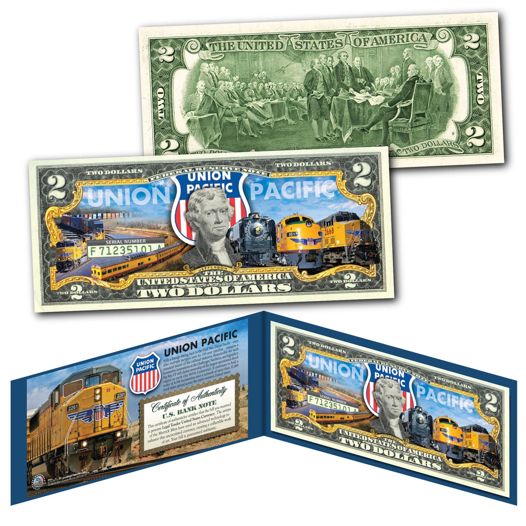 This UNION PACIFIC uncirculated U.S. $2 Bill is Genuine Authentic Legal Tender of the United States, which has been enhanced with beautiful colorized images. With a lineage dating back to the Civil War, Union Pacific - even after multiple mergers over its 150-year timeline - remains a standard bearer of the railroad industry. Responsible for such locomotive innovations as the Challenger, Northern, and legendary Big Boy, UP still claims ownership of the largest operational diesel engine on earth (the #6936 Centennial). It continues to field a roster of 8,500 locomotives over a network of more than 32,000 track miles spread across the entire western United States. The colorized images are accomplished through a revolutionary new authentic & genuine colorization process pioneered by The Merrick Mint, creating a collectible work of art. Each bill comes displayed in a blue folio with a Certificate of Authenticity to guarantee that your bills are authentic and recognized by every monetary authority around the world, therefore assuring its Collector Edition status. Each $2 Bill is in FRESH, CRISP, UNCIRCULATED condition, and was directly removed from untouched wrapped Federal Reserve sealed packs. Former U.S. President Thomas Jefferson is featured on the obverse of the note, along with the special colorization overlay. The Signing of the Declaration of Independence by John Trumbull is featured on the reverse. It is the only U.S. Currency note that features two Presidents, John Adams and Thomas Jefferson, and it is one of the most rarely seen BILLS in circulation and actual use.