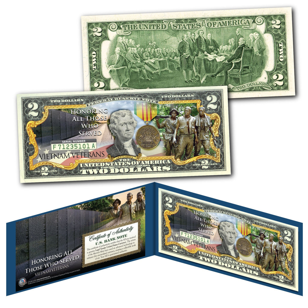This VIETNAM VETERANS uncirculated $2 Bill is Genuine Authentic Legal Tender of the United States, which has been enhanced with beautiful colorized images. Celebrate and honor all those who have served our country with this special $2 bill. The full colorized images are accomplished through a revolutionary new authentic & genuine colorization process pioneered by The Merrick Mint, creating a collectible work of art. Each bill comes displayed in a blue folio with a Certificate of Authenticity to guarantee that your bills are authentic and recognized by every monetary authority around the world, therefore assuring its Collector Edition status. Each $2 Bill is in FRESH, CRISP, UNCIRCULATED condition, and was directly removed from untouched wrapped Federal Reserve sealed packs. Former U.S. President Thomas Jefferson is featured on the obverse of the note, along with the special colorization overlay. The Signing of the Declaration of Independence by John Trumbull is featured on the reverse. It is the only U.S. Currency note that features two Presidents, John Adams and Thomas Jefferson, and it is one of the most rarely seen BILLS in circulation and actual use.