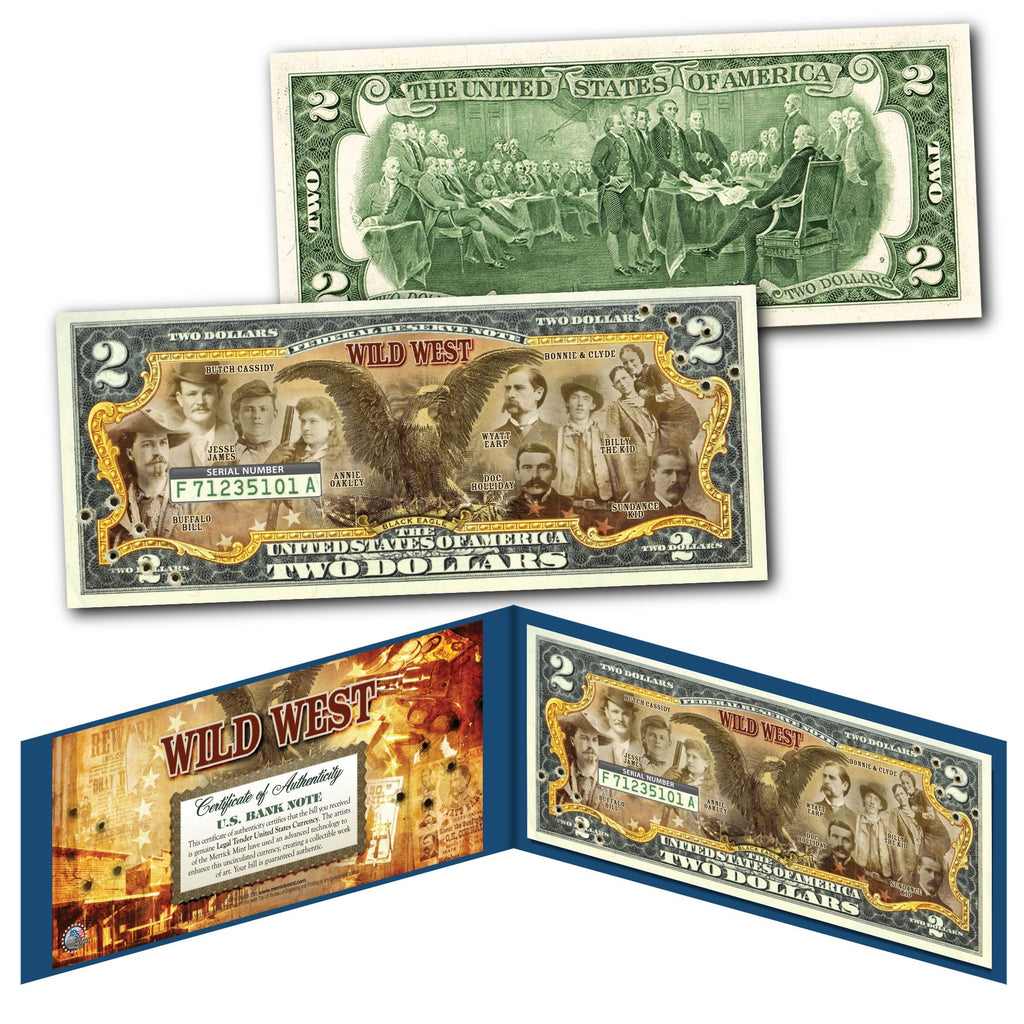 This WILD WEST uncirculated $2 Bill is Genuine Authentic Legal Tender of the United States, which has been enhanced with beautiful colorized images. Featuring the greatest Outlaws in American Western History. The full colorized images are accomplished through a revolutionary new authentic & genuine colorization process pioneered by The Merrick Mint, creating a collectible work of art. Each bill comes displayed in a blue folio with a Certificate of Authenticity to guarantee that your bills are authentic and recognized by every monetary authority around the world, therefore assuring its Collector Edition status. Each $2 Bill is in FRESH, CRISP, UNCIRCULATED condition, and was directly removed from untouched wrapped Federal Reserve sealed packs. Former U.S. President Thomas Jefferson is featured on the obverse of the note, along with the special colorization overlay. The Signing of the Declaration of Independence by John Trumbull is featured on the reverse. It is the only U.S. Currency note that features two Presidents, John Adams and Thomas Jefferson, and it is one of the most rarely seen BILLS in circulation and actual use.