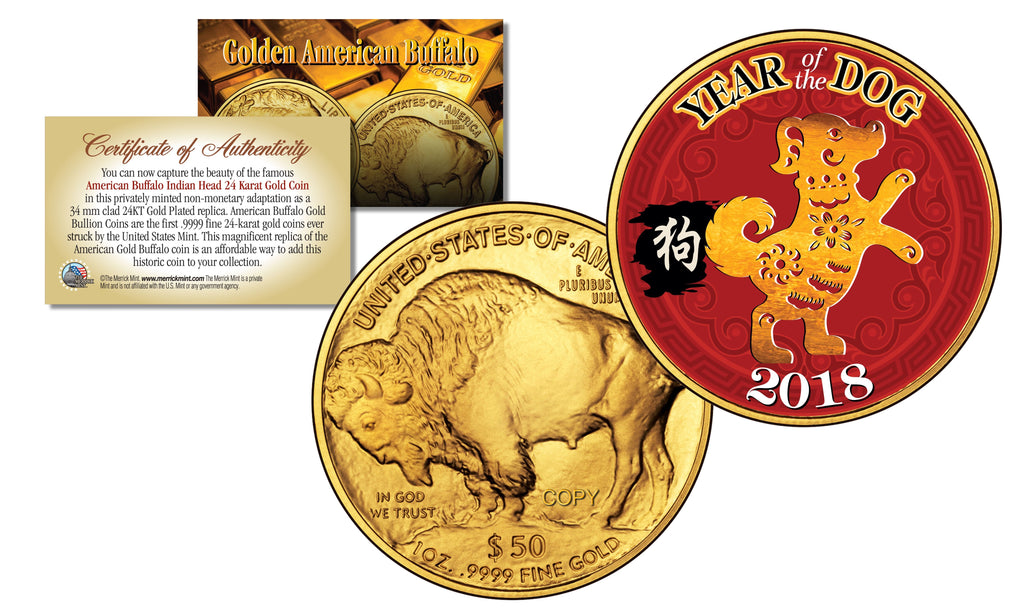 This CHINESE NEW YEAR 2018 – YEAR OF THE DOG COIN is lucky money and a treasured collectible. This high-quality tribute coin has been layered in Genuine 24 Karat Gold, and then enhanced with beautiful colorized images using a unique painstaking multicolor authentic process.