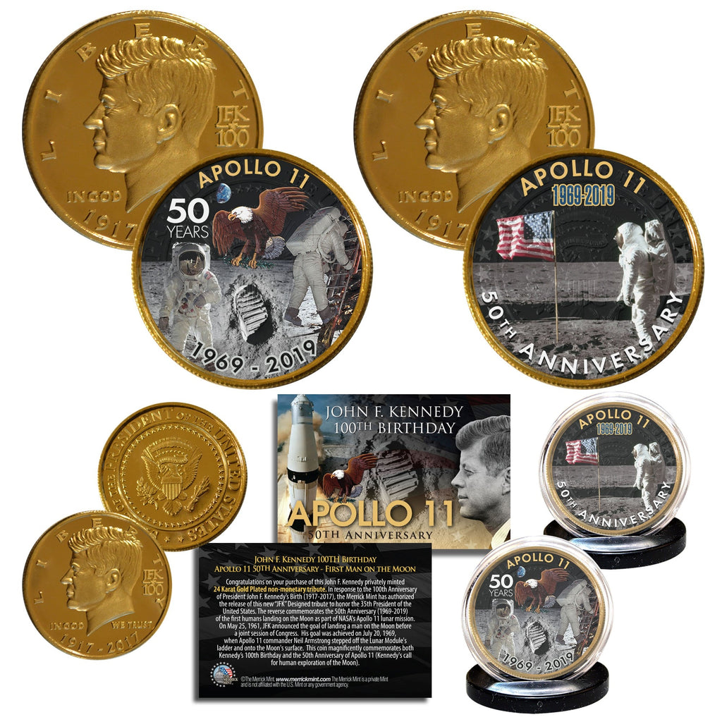 Here is your chance to own this John F. Kennedy privately minted 24 Karat Gold Plated non-monetary tribute 2-coin set. In response to the 100th Anniversary of President John F. Kennedy's Birth (1917-2017), the Merrick Mint has authorized the release of these new "JFK" designed tributes to honor the 35th President of the United States. The reverse commemorates the 50th Anniversary (1969-2019) of the first humans landing on the Moon as a part of NASA's Apollo 11 lunar mission. On May 25, 1961, JFK announced the goal of landing a man on the Moon before a joint session of Congress. His goal was achieved on July 20, 1969, when Apollo 11 commander Neil Armstrong stepped off the Lunar Module's ladder and onto the Moon's surface. These coins magnificently commemorate both Kennedy's 100th Birthday and the 50th Anniversary of Apollo 11 (Kennedy's call for human exploration of the Moon). These coins have been colorized using a unique painstaking multicolor authentic process by the Merrick Mint. Colorizing coins involves the unique application of special inks directly to the surface of a coin that achieves a level of detail, color saturation, and durability that is #1 in the coin industry. The result is an everlasting colorized coin collectible of ultra-high quality. Each coin comes in a premium coin capsule with a Certificate of Authenticity to guarantee that your coins are authentic, assuring its Collector Edition status.