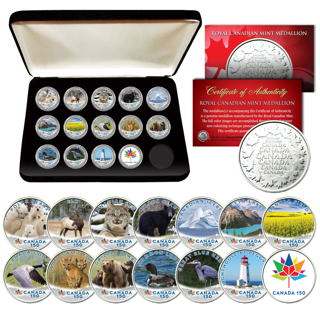 In honor of our country’s 150th Anniversary, The Merrick Mint has released this special set of 14 colorized medallions that features the most iconic wildlife species in Canadian History and culture and the Official 150th Anniversary Logo. The 150th anniversary of Canada, also known as the 150th anniversary of Confederation and promoted by the Canadian government as Canada 150, occurred in 2017 as Canada marked the sesquicentennial anniversary of Canadian Confederation. This 14 Coin Set of Medallions has been beautifully enhanced with colorized images by the Merrick Mint. Each set comes with a full color Certificate of Authenticity with each medallion is packaged in premium coin capsules. These medallions have been colorized with an application of special inks directly to the surface, using a unique and painstakingly multicolor process, which achieves a level of detail, color saturation, and durability that is #1 in the industry. Each medallion is about the same size as a U.S. Half Dollar coin and features a Canada Maple Leafs design on the reverse and a colorized images on the obverse.