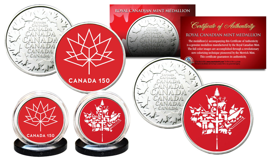To celebrate the 150th Anniversary of Canada, the Merrick Mint has released a two coin set featuring original Royal Canadian Mint medallions with Canada 150 Red colorized images. Coins feature colorized images of the Canada 150 logo in red. Each medallion on the back features Maple Leafs and the words Canada. The 150th anniversary of Canada, also known as the 150th anniversary of Confederation and promoted by the Canadian government as Canada 150, occurred in 2017 as Canada marked the sesquicentennial anniversary of Canadian Confederation. The 2-medallion set has been beautifully enhanced with colorized images by the Merrick Mint. The 2-medallion set comes with a full color Certificate of Authenticity with each medallion coming in a premium coin capsule. These medallions have been colorized with an application of special inks directly to the surface, using a unique and painstakingly multicolor process, which achieves a level of detail, color saturation, and durability that is #1 in the industry. Each medallion is about the same size as a U.S. Half Dollar coin and features Canada Maple Leafs design on the reverse and a colorized image on the obverse.