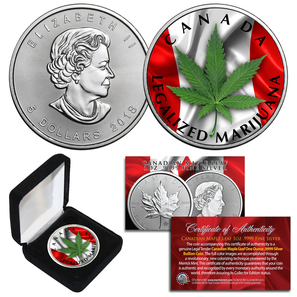 CANADA LEGALIZED MARIJUANA Colorized 2018 Genuine .9999 Silver 1 oz CANADA MAPLE LEAF BU with Box