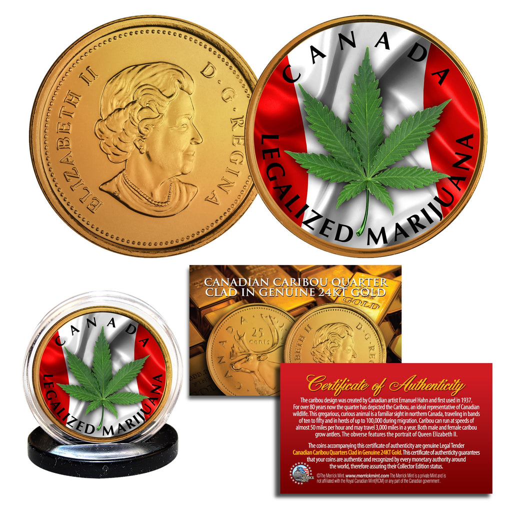 Here is your opportunity to own a CANADA LEGALIZED MARIJUANA Genuine Canadian Caribou Quarter (Lot of 2). These Gold Plated Canadian Quarters are Genuine Authentic Legal Tender of the Canada, which have been layered in Genuine 24 Karat Gold, and then beautifully enhanced with colorized images by the Merrick Mint. These high-quality genuine Legal Tender Canadian coins have been colorized using a unique painstaking multicolor authentic process. Colorizing coins involves the unique application of special inks directly to the surface of a coin that achieves a level of detail, color saturation, and durability that is #1 in the industry. The result is an everlasting colorized coin collectible of ultra-high quality. Each lot comes with a Certificate of Authenticity to guarantee that your coins are authentic and recognized by every monetary authority around the world, assuring its Collector Edition status. Each coin comes in a premium coin capsule.